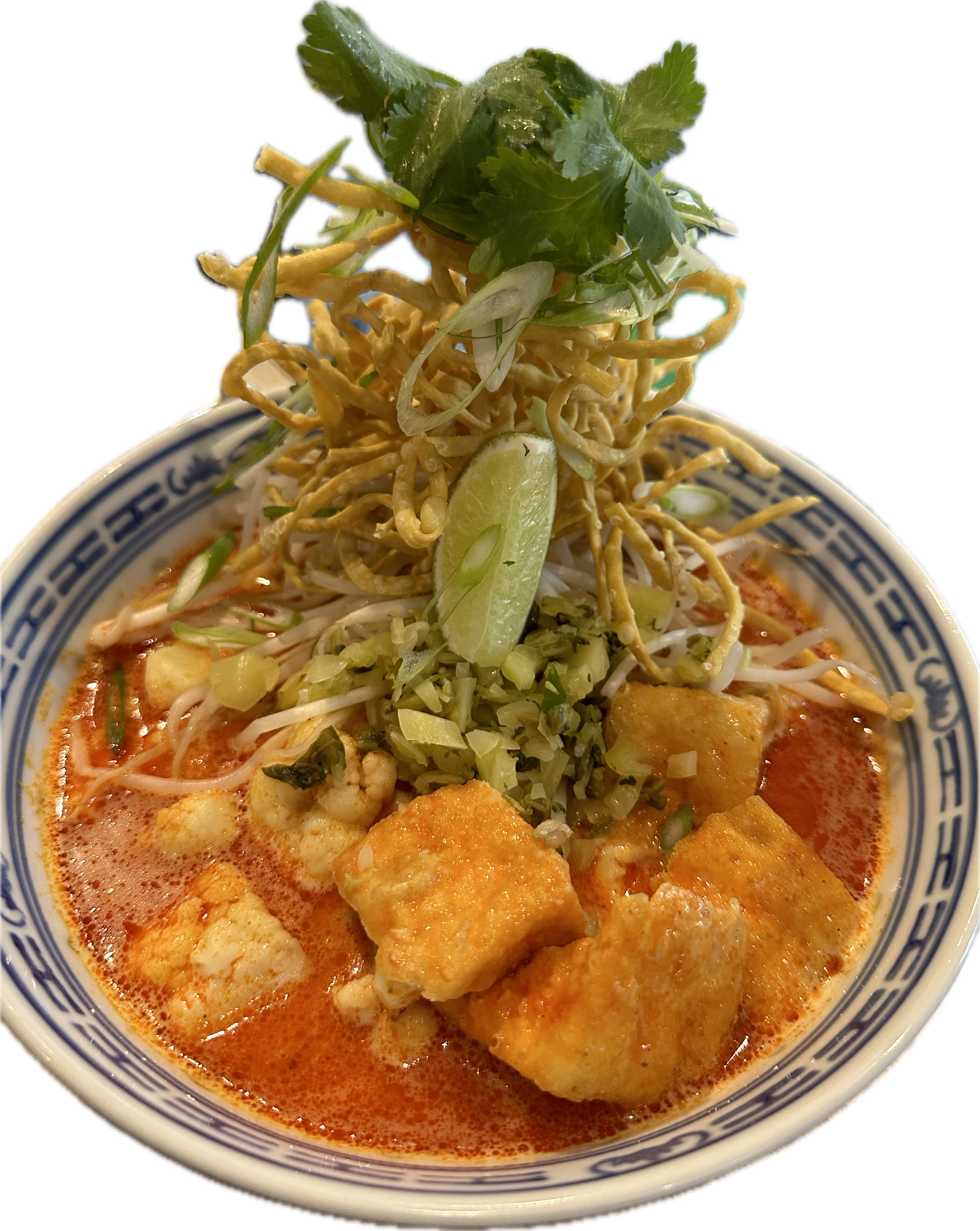 Steamed cauliflower and tofu puffs in a Northern Thai curry. Garnished with beansprouts, pickled mustard greens and crispy noodles. Served with Flat egg noodles.