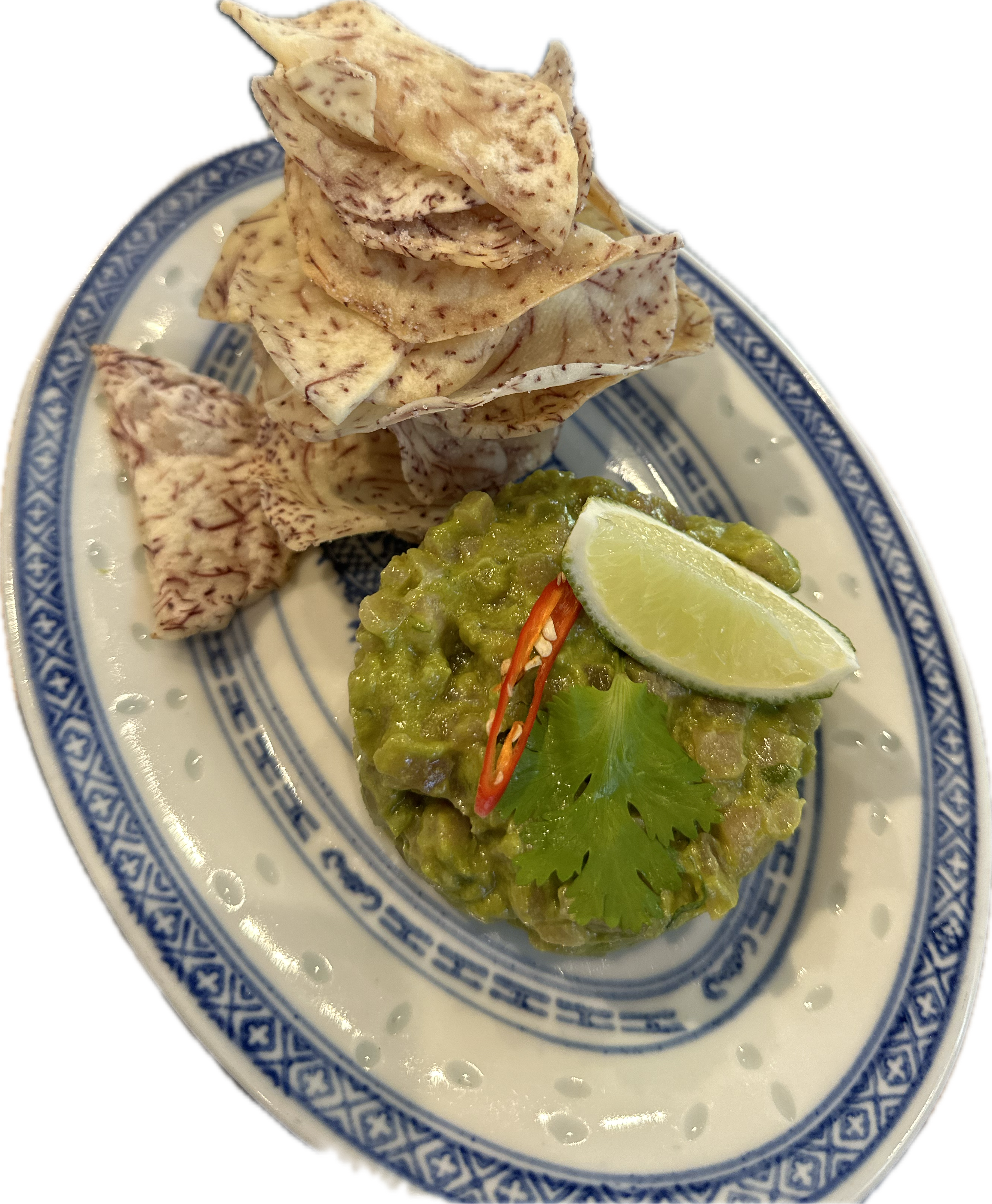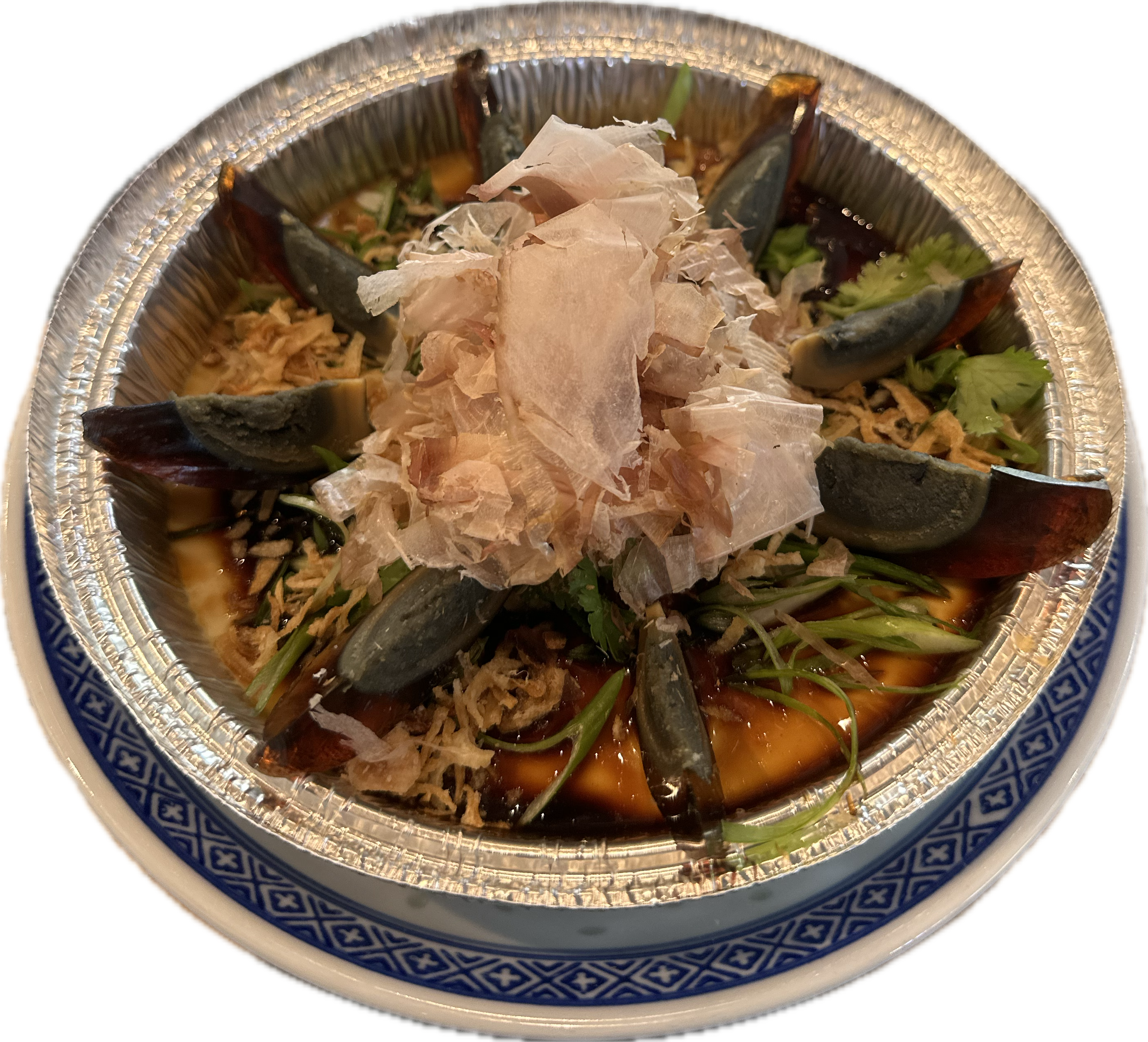 Fried shallots, bonito flakes, green onion, cilantro, and black garlic sauce.