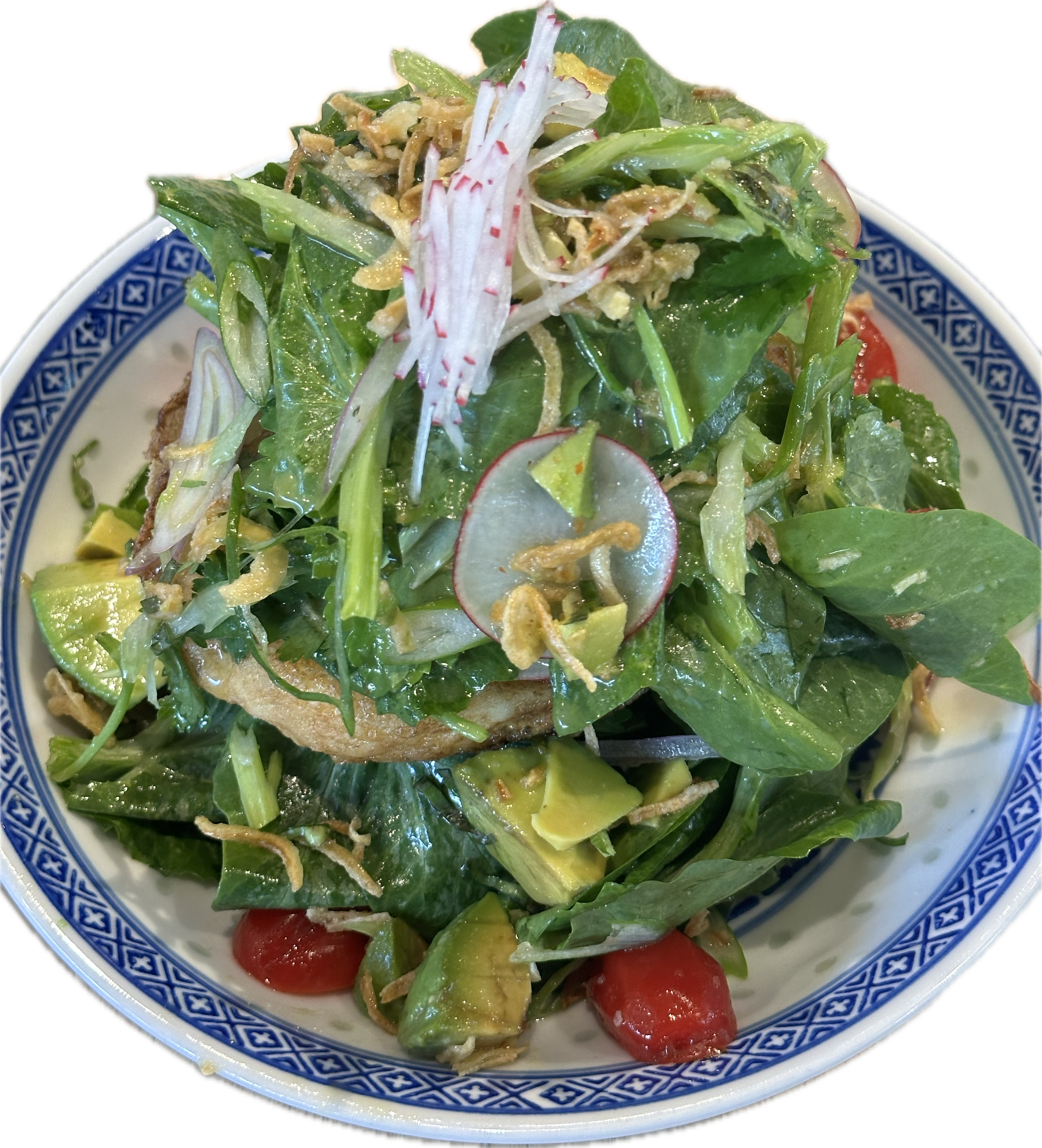 Avocado, Asian celery, pea tips, cherry tomatoes, cilantro and two fried eggs.
