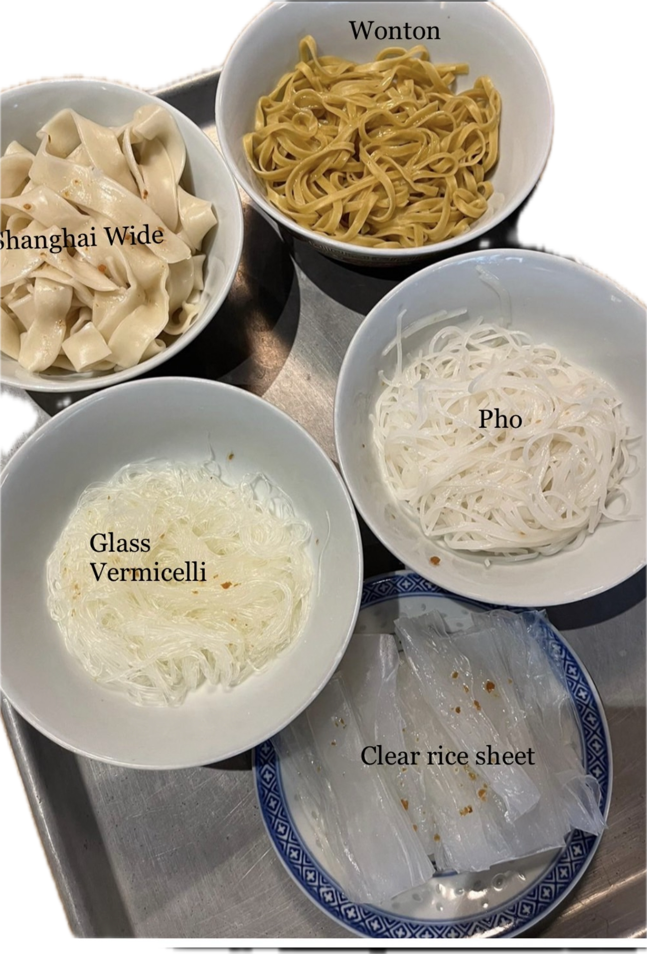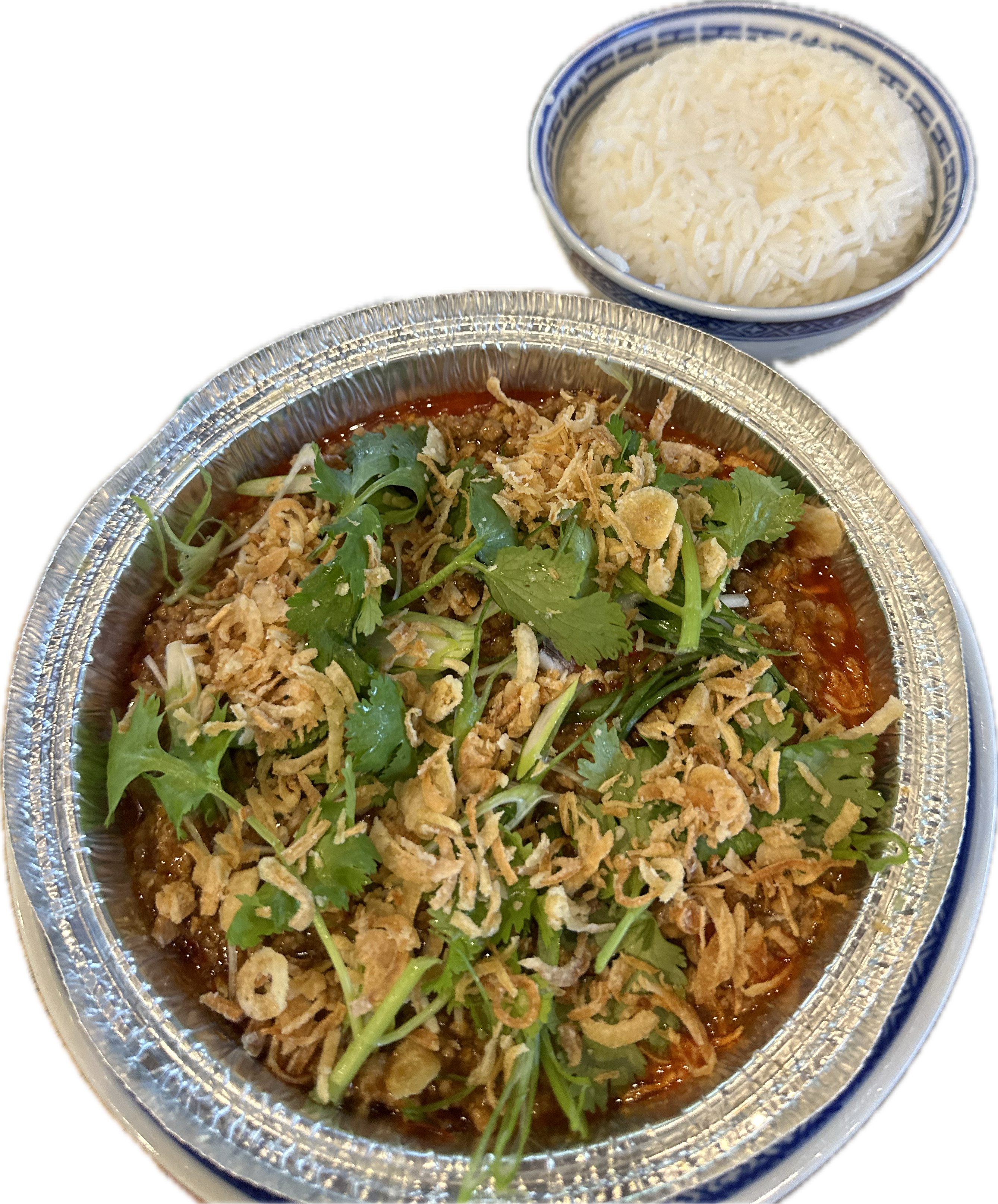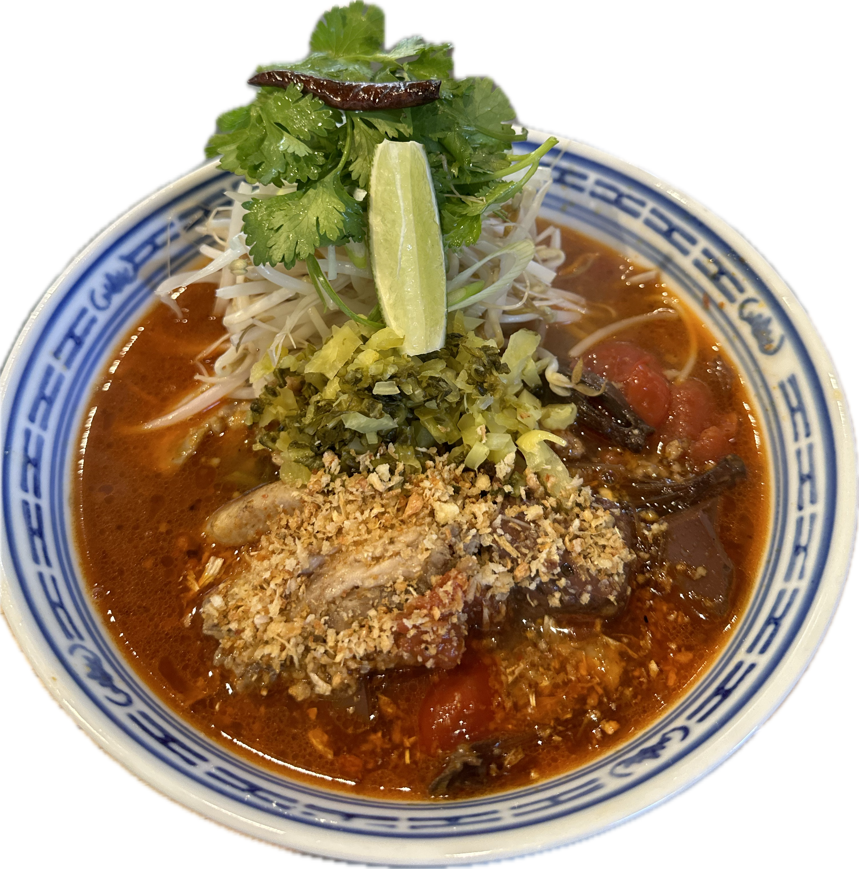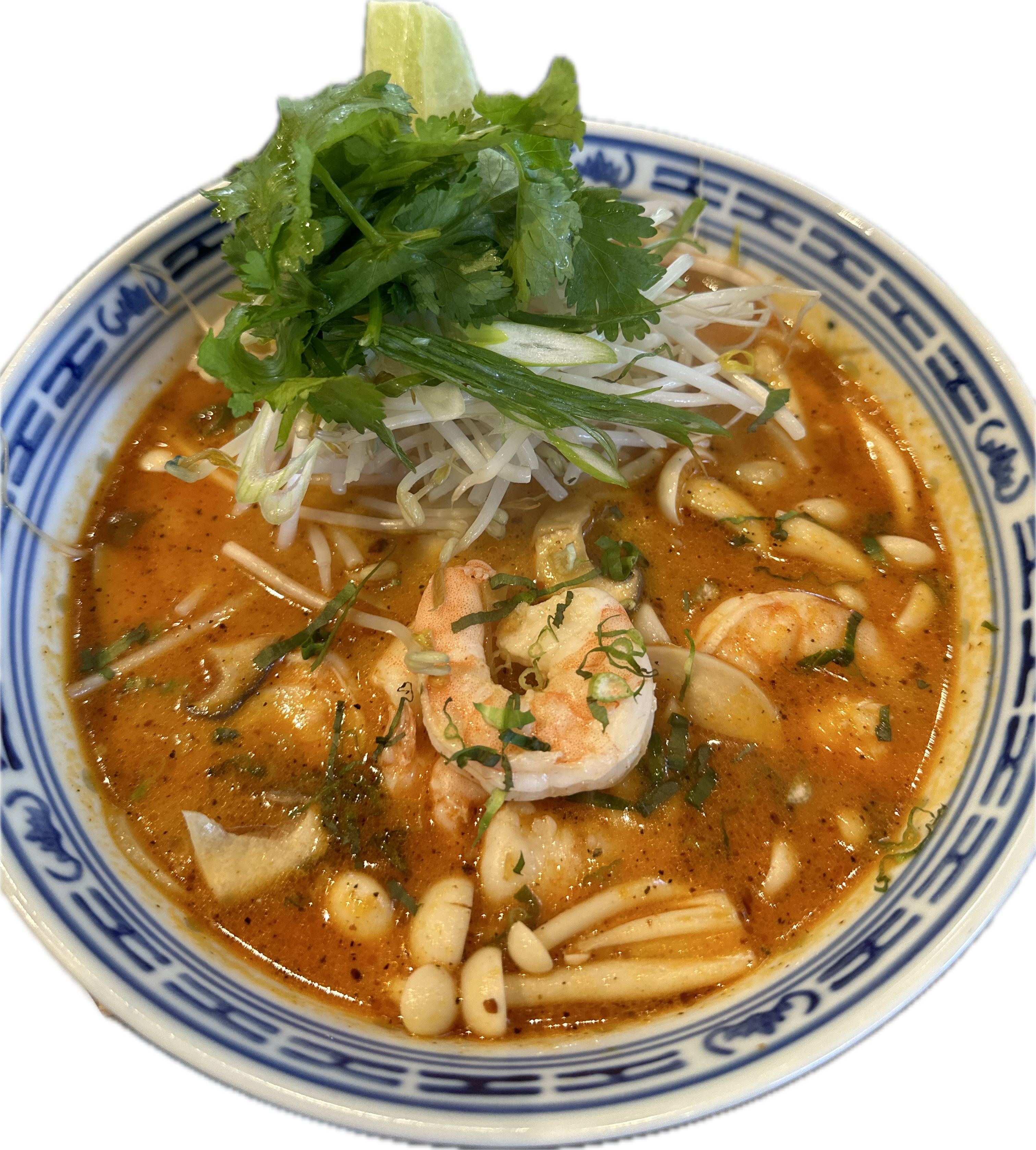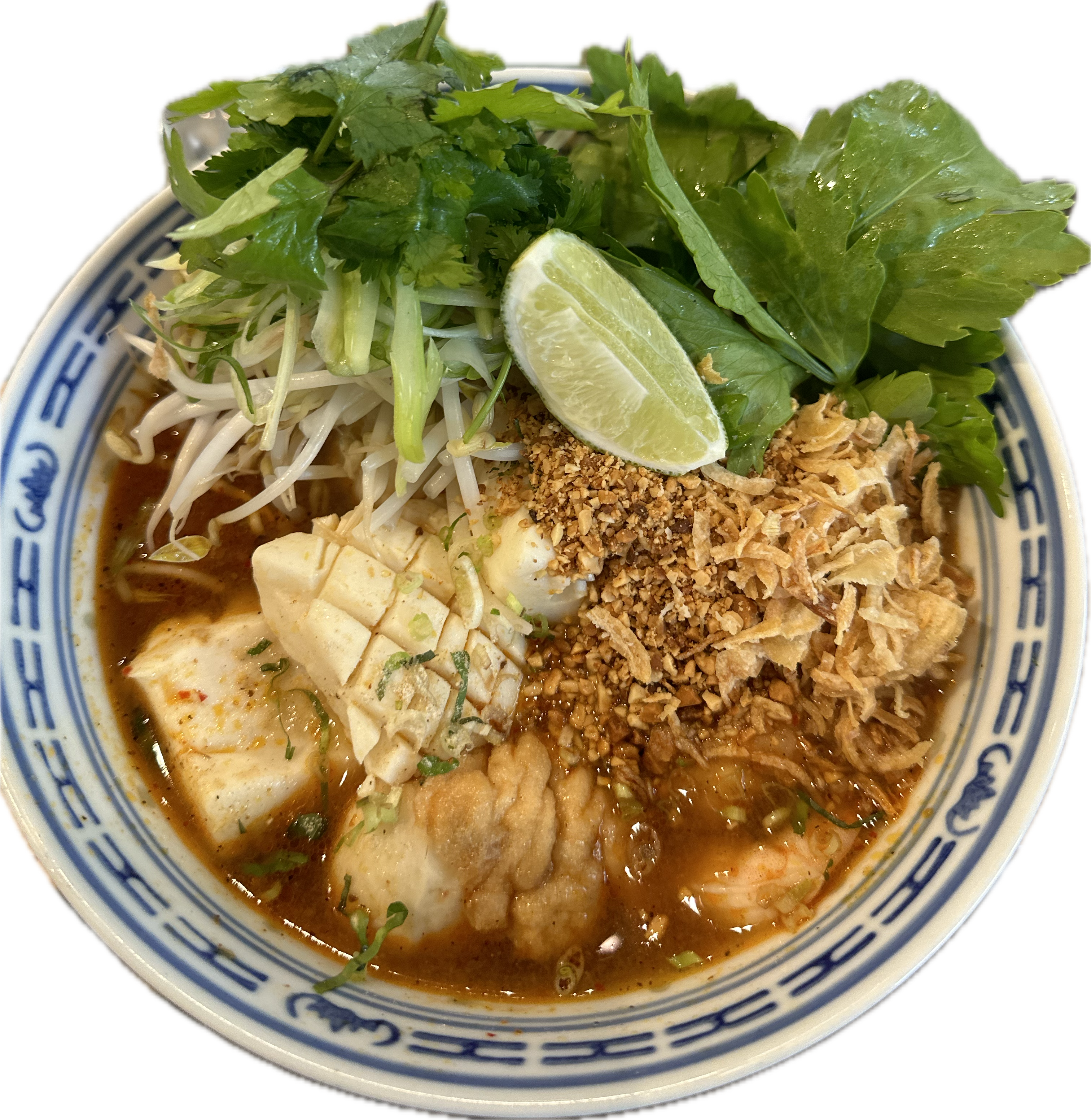 Rich pork ribs & pork blood in tomato soup. Garnished with mustard greens, fried garlic & chilies, and red cotton tree flowers. Served with thick rice vermicelli.