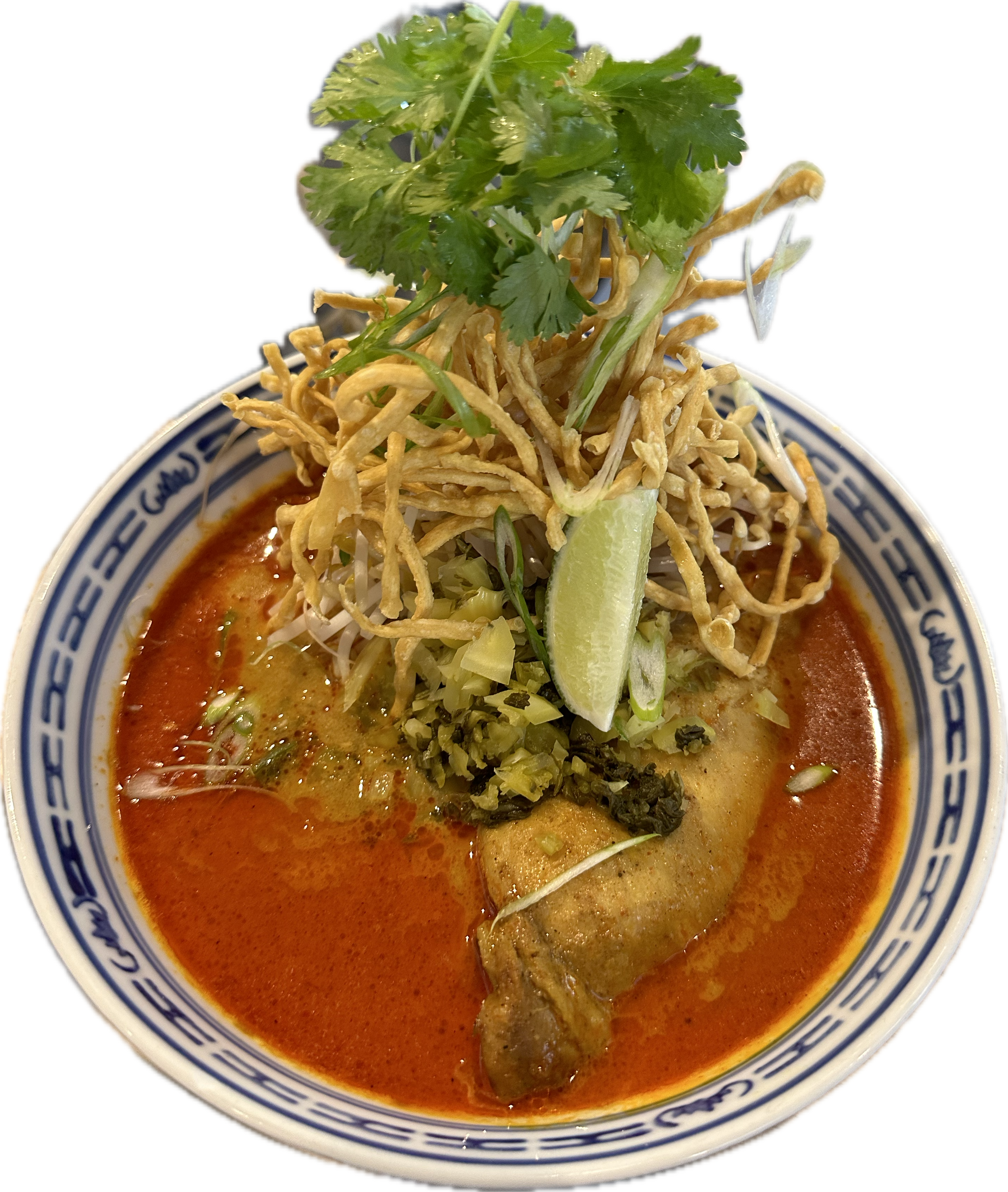 Braised chicken leg in creamy northern Thai-style curry. Pickled mustard greens. Served with flat egg noodles and crispy noodles. Contains shellfish