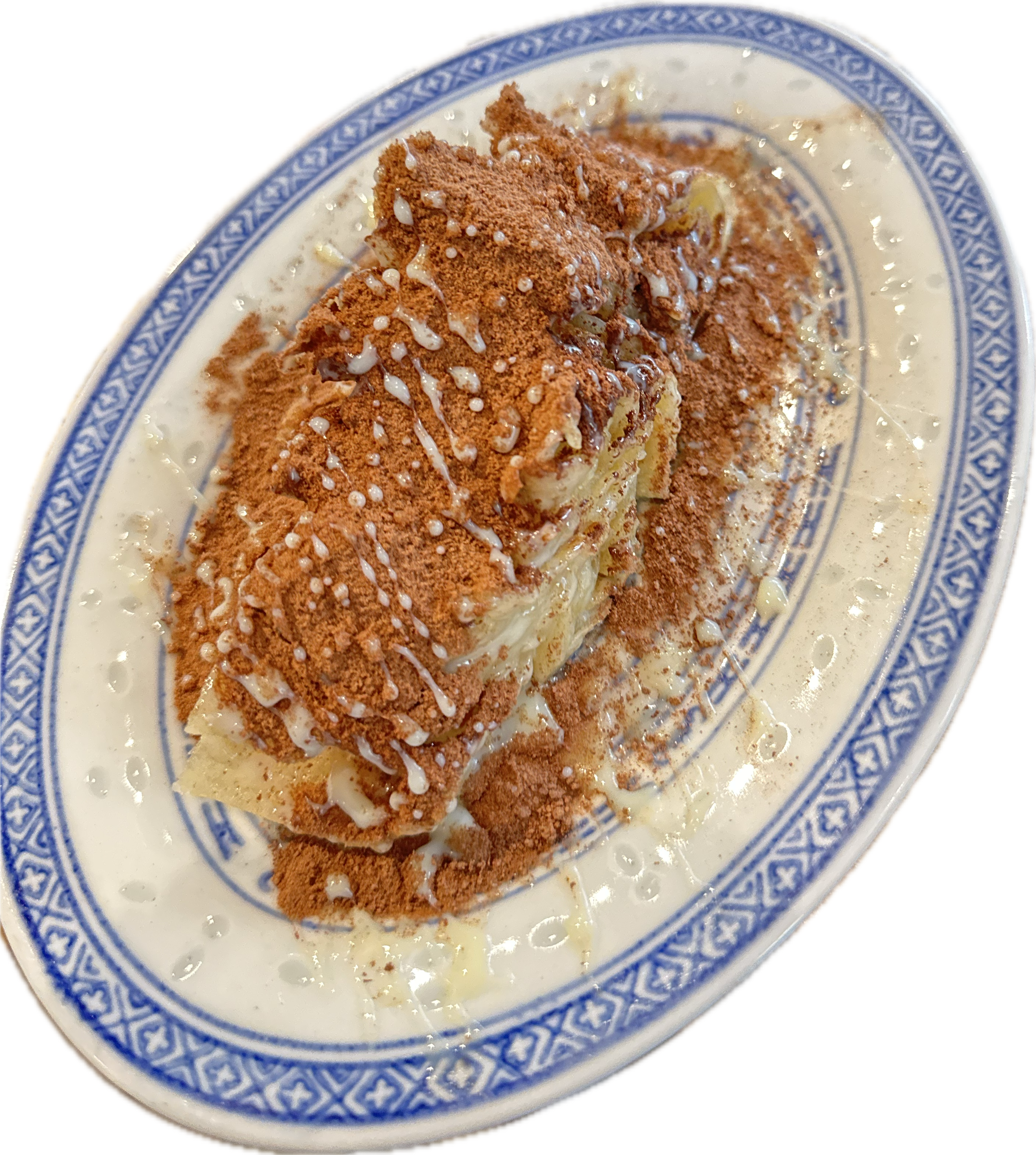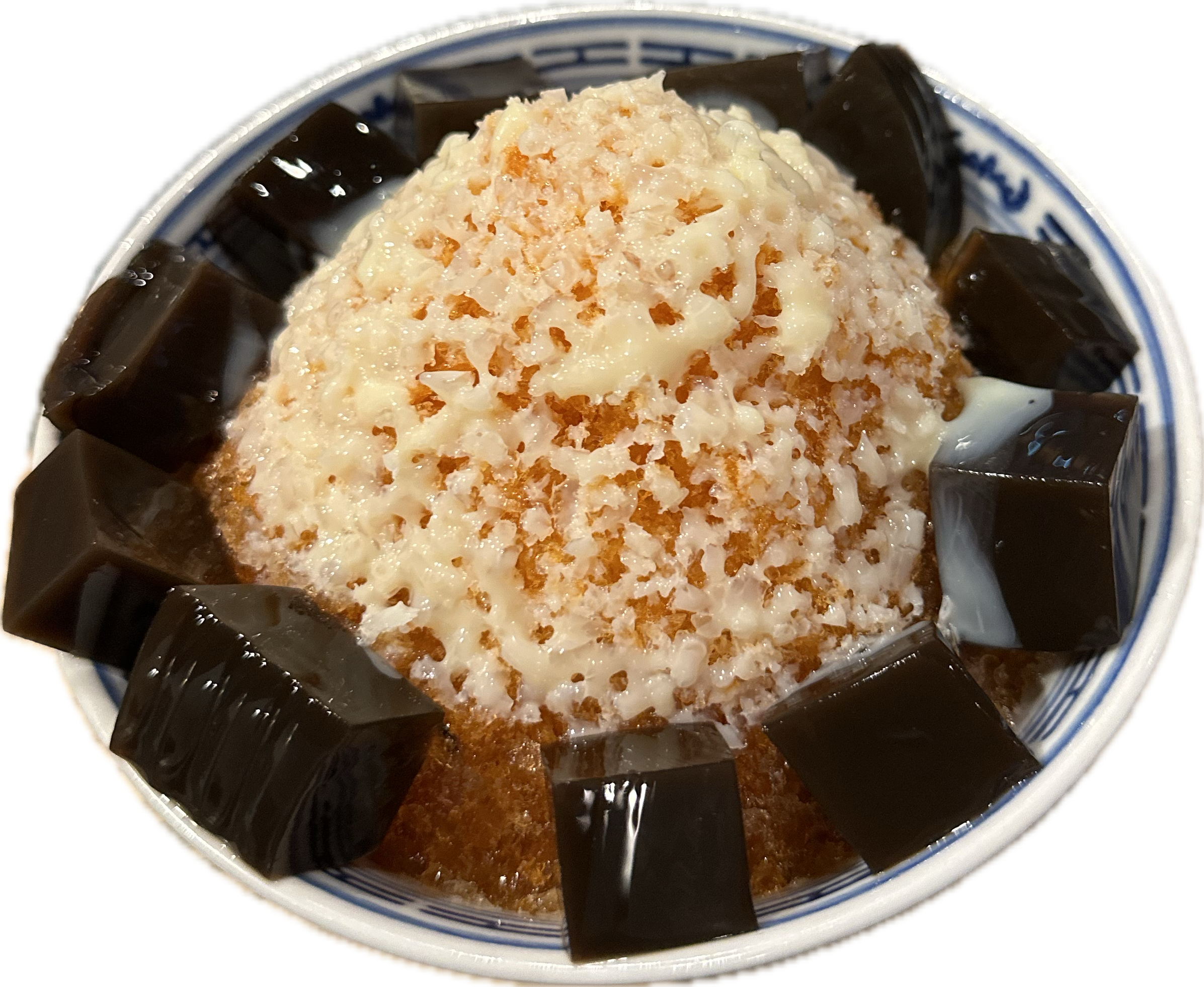 Thai Iced Tea Panna Cotta with shaved ice topping, syrup, and condensed milk.
