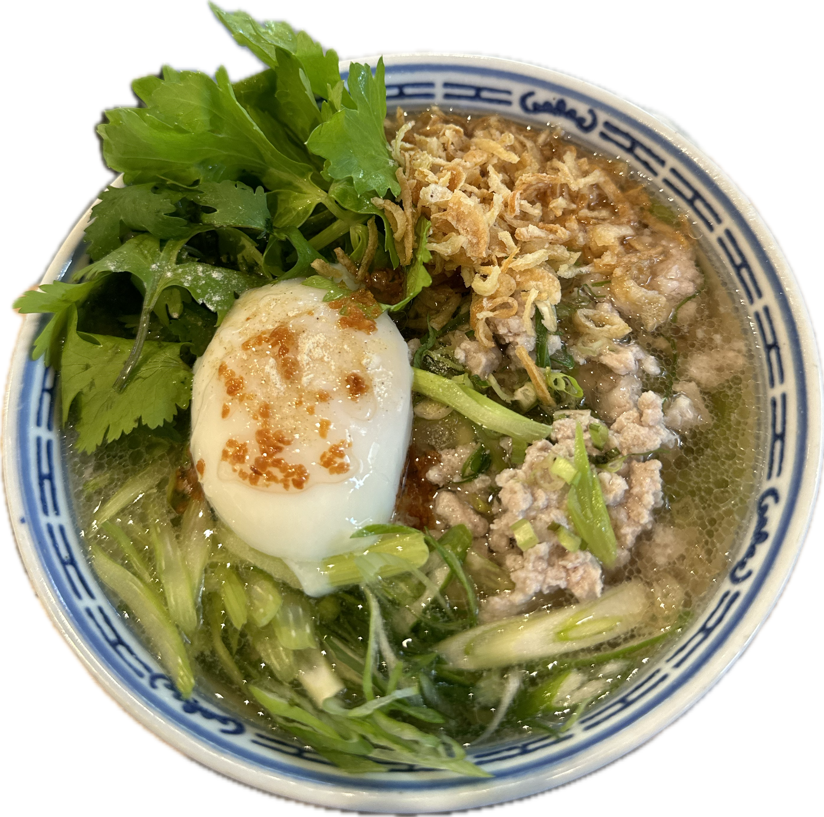 Poached egg, minced pork, Asian celery, green onion, cilantro, in a pork broth.